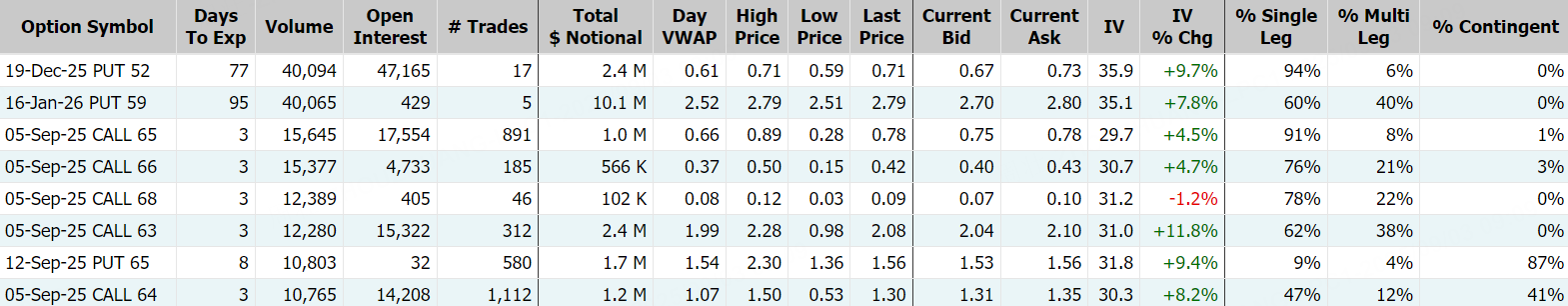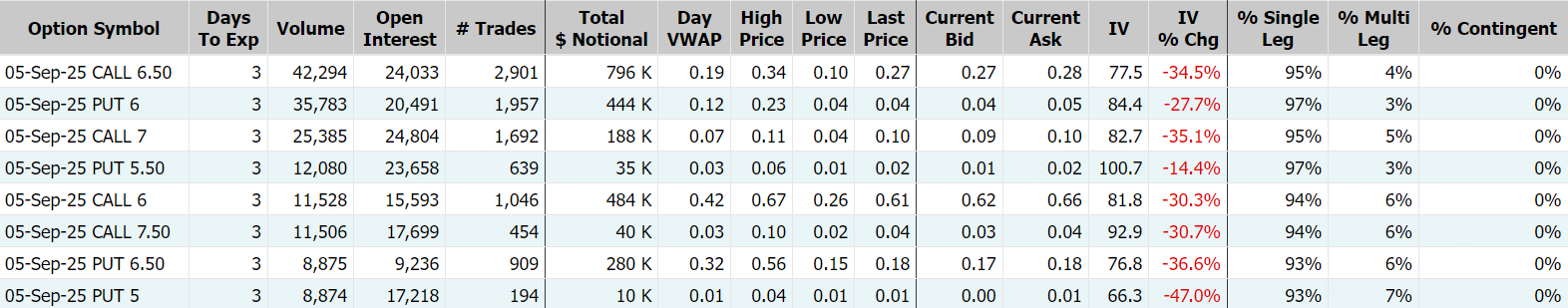 期权方面,蔚来当日期权成交40.62万张,较90日均量放大逾2倍,看涨期权占比升至64.8%,其中于9月5日到期的6.5美元行使价的看涨期权成交居前,成交逾4.2万张。 $NIO 20250905 6.5 CALL$