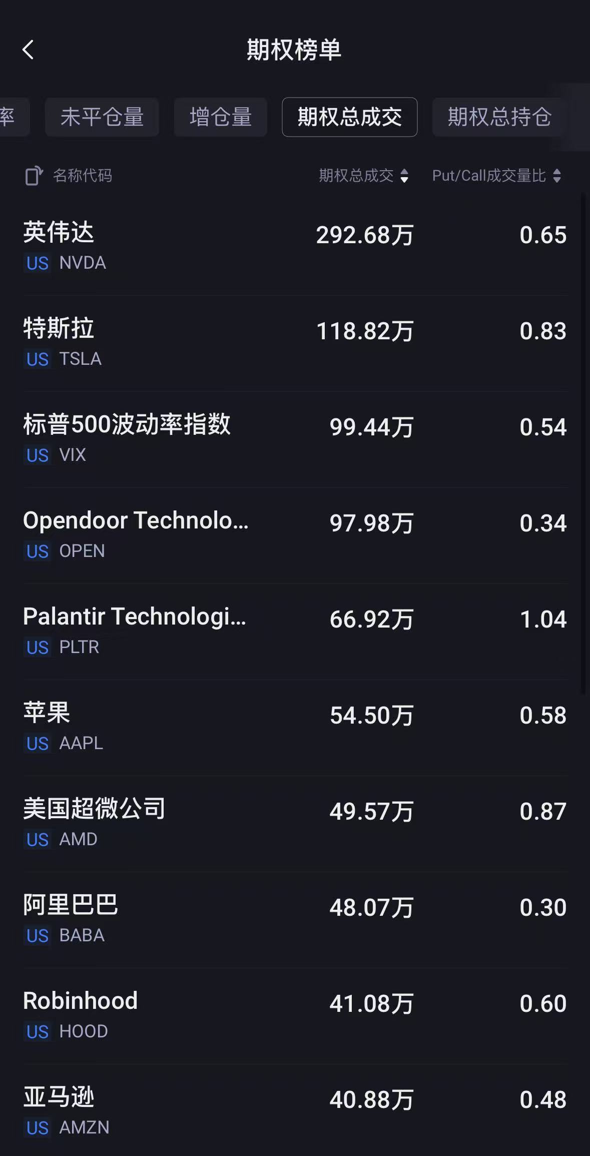 大型科技股多数走低,期权成交环比前一交易日均有所下滑,其中英伟达成交292.68万张、特斯拉成交118.82万张、苹果成交54.5万张、AMD成交49.57万张、亚马逊成交40.88万张,看涨期权占比均有下降。