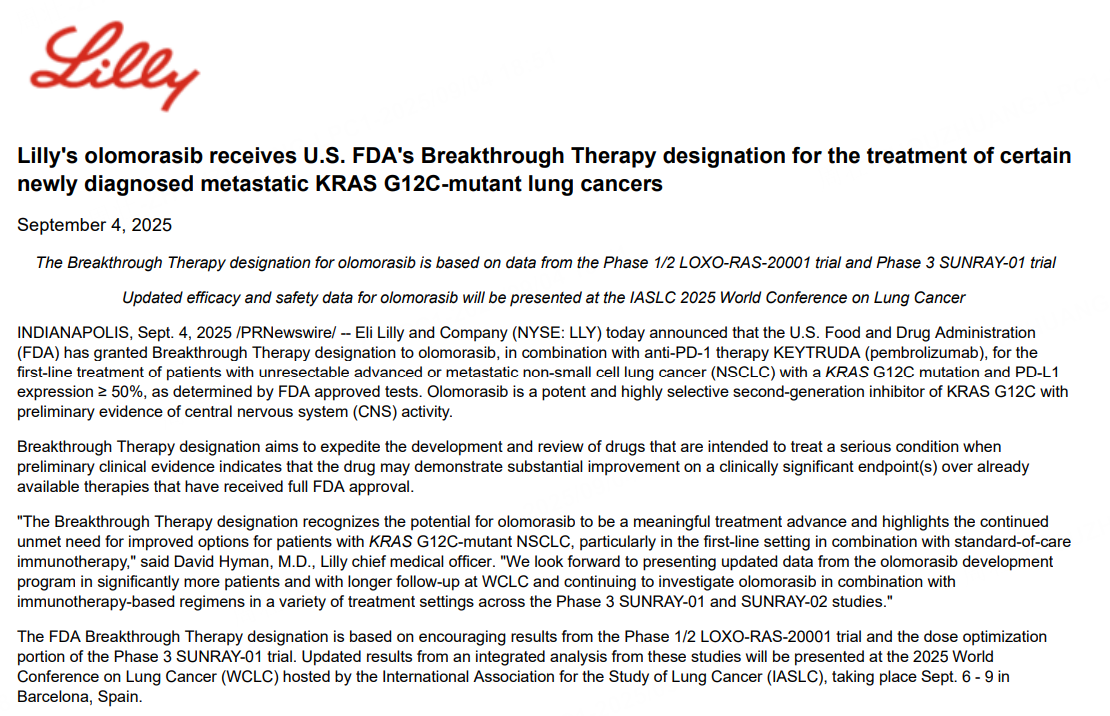 9月4日,礼来药物Olomorasib获得美国FDA突破性疗法认定,用于治疗特定新诊断的转移性KRASG12C突变肺癌。