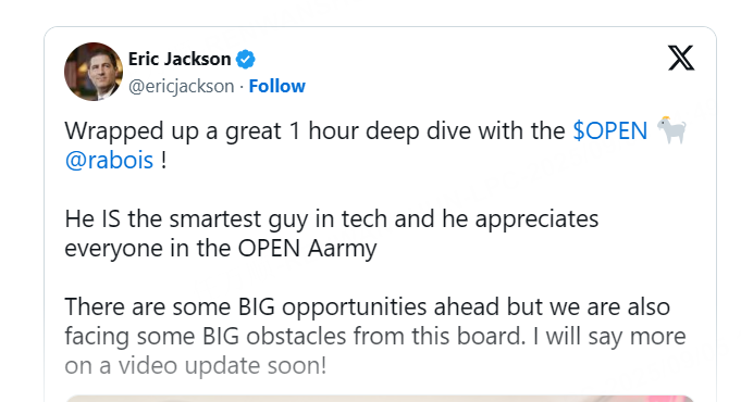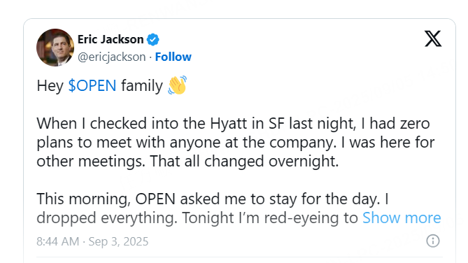 杰克逊周二在X上写道,他受邀在旧金山与Opendoor管理层会面,并随后与公司及董事会的人员交流。