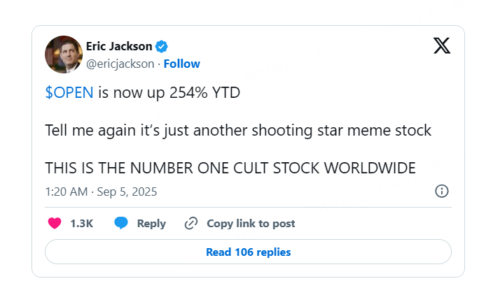 然而,EMJ Capital创始人杰克逊表示,Opendoor并不是迷因股。“再跟我说一次,这只是另一只昙花一现的迷因股?”他周四下午在X(前推特)上写道,“这可是全球第一热门股。”