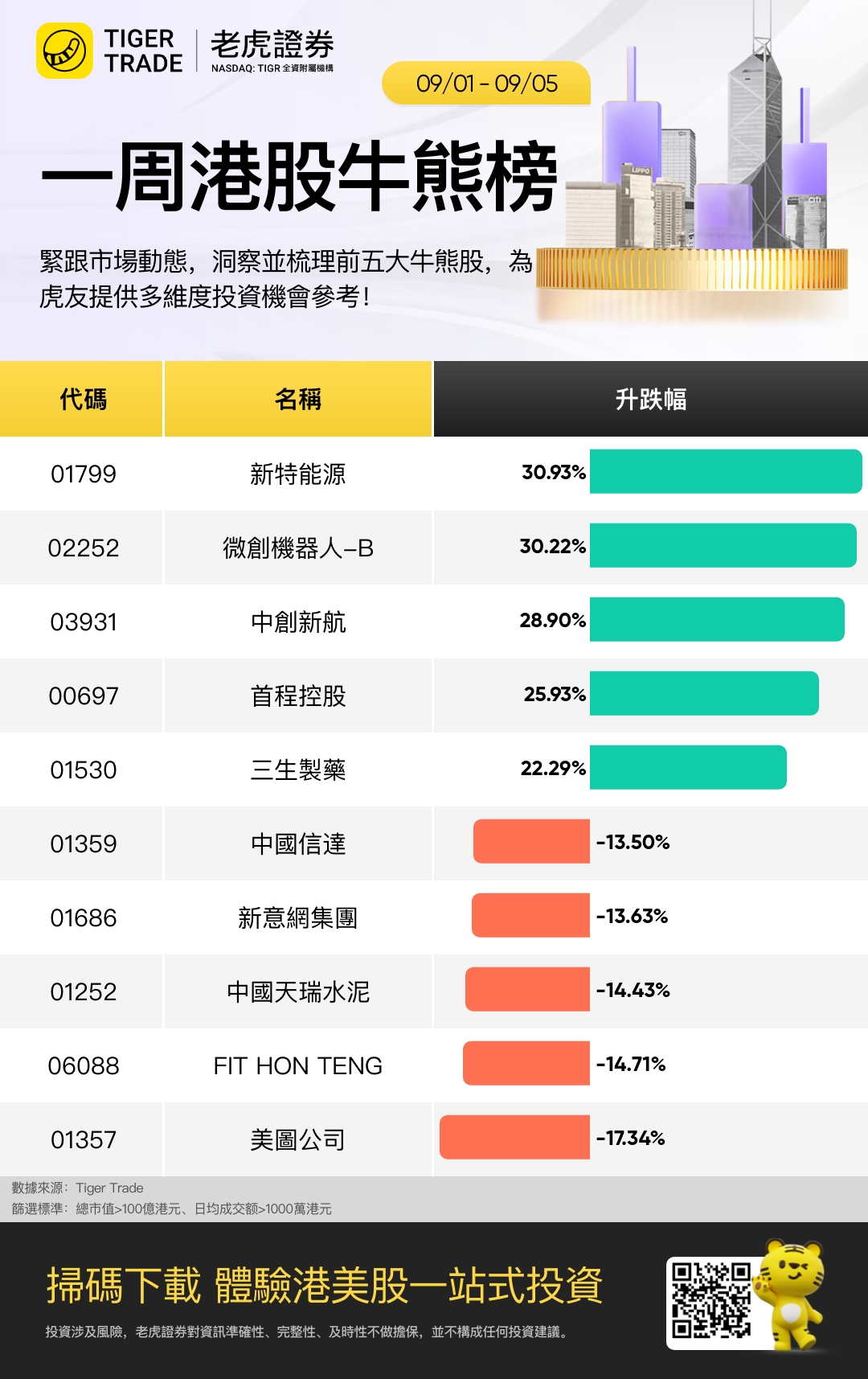 本周市值百亿以上、日均成交千万以上表现最好五只股票是 新特能源 、 微创机器人-B 、 中创新航、 首程控股 、 三生制药 ;