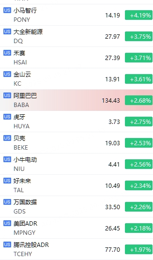 热门中概股走高,小马智行涨超4%,金山云、禾赛涨超3%,美团、阿里、好未来、腾讯涨2%。