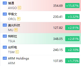 明星科技股多数上涨,博通涨超15%,甲骨文涨超3%,美光、特斯拉、台积电涨超2%;