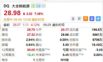 大全新能源涨逾7%,市场预期太阳能行业或接近转折点。