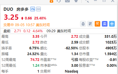 华盛资讯9月5日消息,房多多延续本周涨势,股价飙升超25%,
