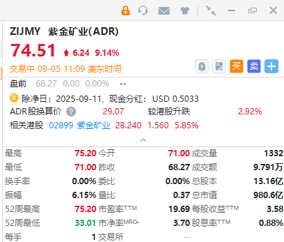 紫金矿业ADR涨超9%,黄金在非农报告后一度创新高