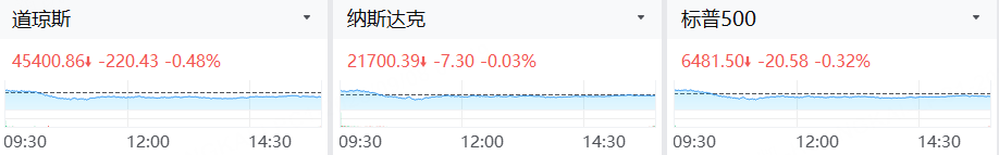 美东时间上周五,美股三大指数集体收跌,截至收盘,道指跌幅0.48%,报45400.86点;纳指跌幅0.03%,报21700.388点;标普500跌幅0.32%,报6481.50点。