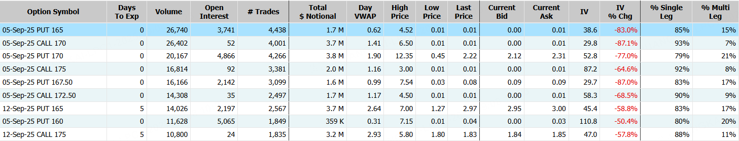 Lululemon Athletica上周五重挫超18%,期权合约成交56.65万张,较90日均量放大11.2倍。9月5日到期的165美元的行权看跌期权交易量特别高,共有26,740份合约交易。