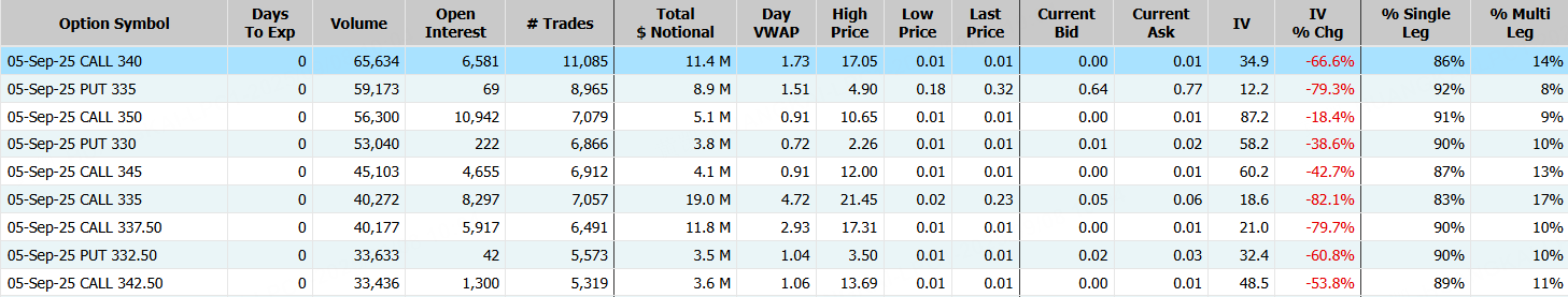 博通上周五涨超9%,期权合约成交142.72万张,较90日均量放大7.1倍。9月5日到期的340美元的行权看涨期权交易量特别高,共有65,634份合约交易。