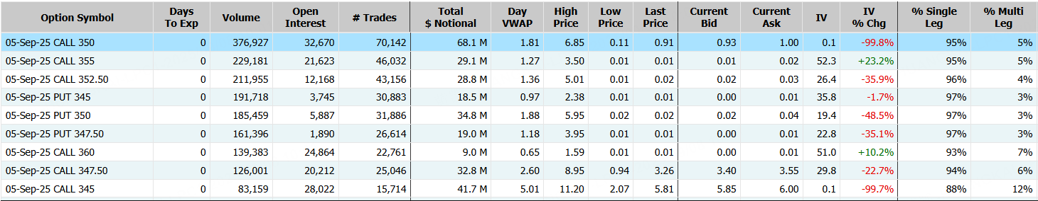 特斯拉上周五收高3.64%,期权合约成交402万张。9月5日到期的350美元的行权看涨期权交易量特别高,共有376,927份合约交易。