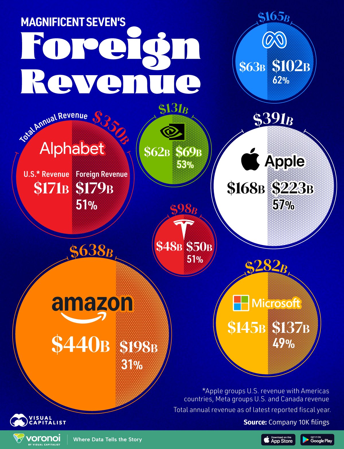 根据最新年度10-K文件,下图对比美股“七巨头”的海外收入及其在总收入中的占比情况。其中,Meta的海外收入占比最高,约为62%。亚太地区是Meta海外收入的最大贡献者,欧洲紧随其后。苹果排名第二,海外收入占总销售额的57%。然而,苹果海外收入的绝对值(2230亿美元)高于其他公司。英伟达的海外收入占比约为51%,最大的海外市场包括新加坡、中国台湾和中国大陆。谷歌母公司Alphabet和特斯拉的海外收入占比均为51%,微软则为49%。另一方面,亚马逊的海外收入占比最低,仅为31%。
