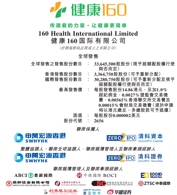 华盛资讯9月9日消息, “领先的数字医疗综合服务供应商”健康160今起招股,每股招股价11.89-14.86港元,每手250股,一手入场费3752.47港元,预期将于9月17日挂牌上市。