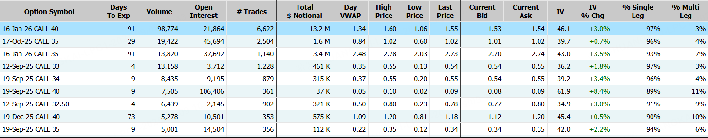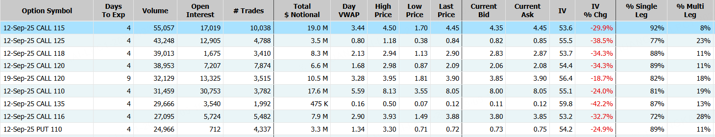 Robinhood隔夜涨近16%,当日期权合约成交达112.85万张,较90日均值放大3.3倍。9月5日到期的115美元的行权看涨期权交易量特别高,共有55,057份合约交易。 $HOOD 20250912 115.0 CALL$