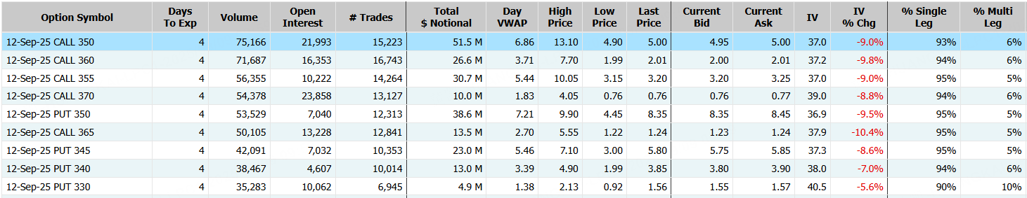 美国市场份额创8年新低,特斯拉隔夜跌超1%。期权合约成交157.80万张,9月12日到期的350美元的行权看涨期权交易量特别高,共有75,166份合约交易。 $TSLA 20250912 350.0 CALL$