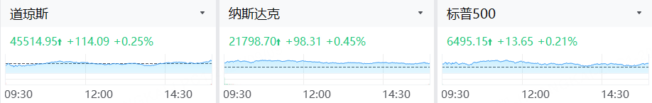 周一,美国三大股指小幅收高。道琼斯工业平均指数涨0.25%,报45514.95点;标普500指数涨0.21%,报6495.15点;纳斯达克综合指数涨0.45%,报21798.7点。