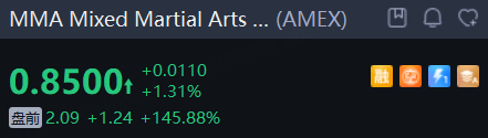 Mixed Martial Arts Group一度飙升480%,截至发稿涨幅超145%,小唐纳德·特朗普出任该公司战略顾问。