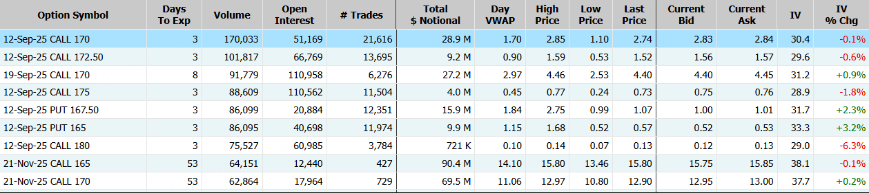 英伟达隔夜涨超1%,期权合约成交199.85万张,9月12日到期的170美元的行权看涨期权交易量特别高,共有170,033份合约交易。 $NVDA 20250912 170.0 CALL$