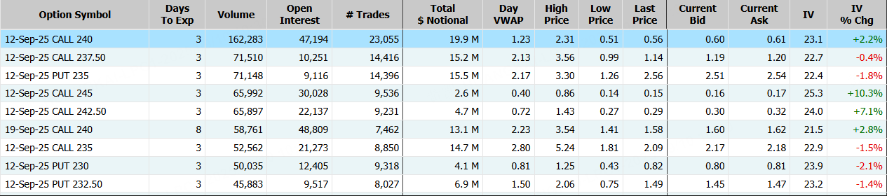苹果隔夜跌超1%,期权合约成交131.62万张,9月12日到期的240美元的行权看涨期权交易量特别高,共有162,283份合约交易。 $AAPL 20250912 240.0 CALL$