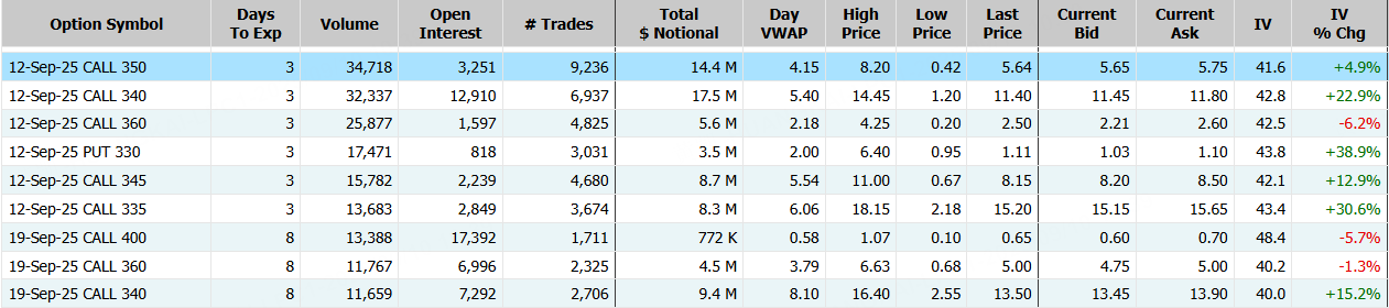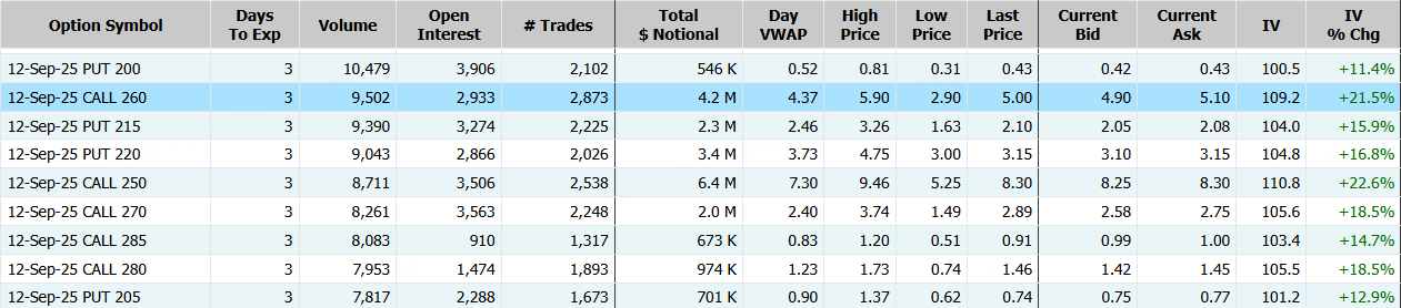 甲骨文隔夜上涨超1%,盘后大涨逾28%。期权市场交投活跃,合约成交量达39.62万张,约为90日均值的3.5倍。其中,9月12日到期、行权价260美元的看涨期权交易量居首,共成交9,502张。 $ORCL 20250912 260.0 CALL$