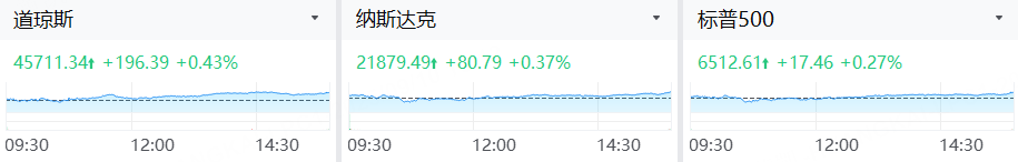 周二,美股三大指数收涨。截至收盘,道琼斯指数涨0.43%,报45711.34点;标普500指数涨0.27%,报6512.61点;纳斯达克综合指数涨0.37%,报21879.49点。