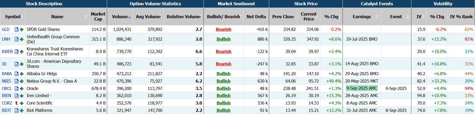 联合健康隔夜涨近9%,期权合约成交88.75万张,较90日均量放大2.8倍。9月12日到期的350美元的行权看涨期权交易量特别高,共有34,718份合约交易。 $UNH 20250912 350.0 CALL$