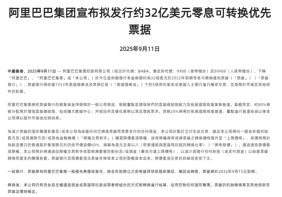 9月11日,阿里巴巴公告,于11日宣布拟发行本金总额约为32亿美元于2032年到期零息可转换优先票据。将把票据发行的募集资金净额用于一般公司用途,具体而言,约80%将被分配用于增强云基础设施,包括扩大数据中心、升级技术及优化服务以满足增长需求。其余20%将用于拓展国际商业营运,重点进行营运投资以使本公司得以提升市场地位与效率。