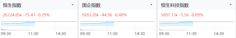 9月11日,港股午间收盘,恒生指数跌0.29%,恒生科技指数跌0.09%,国企指数跌0.48%。