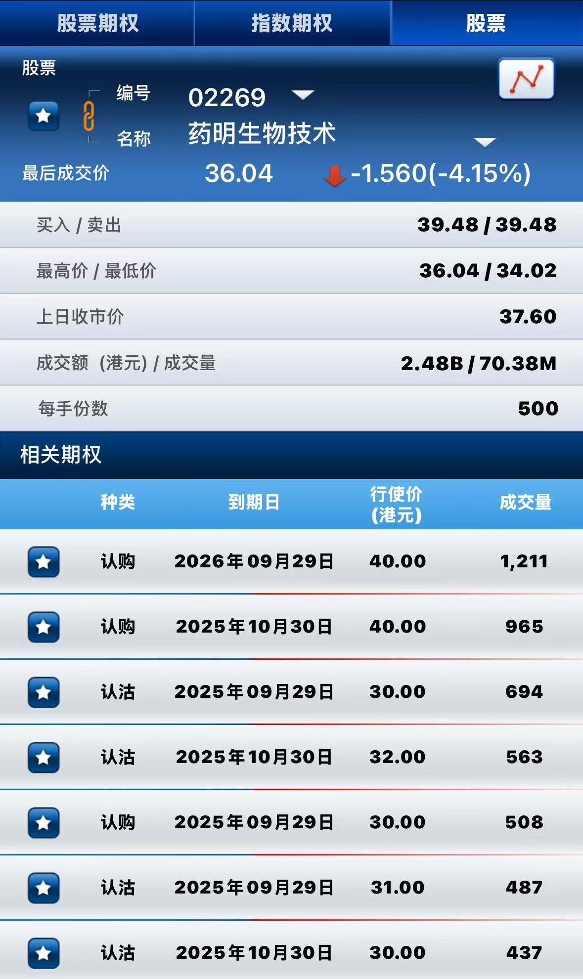 期权方面: 药明生物半日成交超1.1万张合约,其中于9月29日到期行权价40港元的认购期权成交量居前,成交超1200张合约。$WXB.HK 20250929 40.00 CALL$