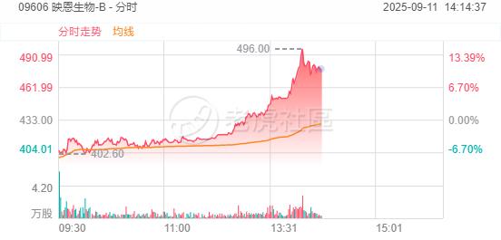 9月11日,映恩生物-B午后拉升一度涨超15%,股价逼近500港元,续创上市以来新高。