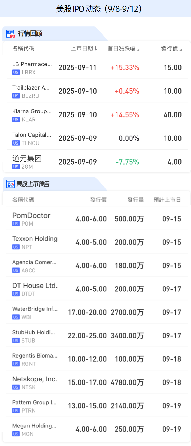 美股方面,本周预计共有8只新股上市,区块链借贷平台Figure上市首日涨24%,“欧洲花呗”Klarna首日一度涨超40%;此外,明星公司Gemini预计本周五晚间登陆美股市场。
