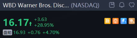 Warner Bros. Discovery 盘前续涨超4%,昨日大涨约29%。据知情人士透露,派拉蒙天舞(Paramount Skydance)正在与一家投行合作,准备向华纳兄弟探索(Warner Bros. Discovery)提出收购要约。