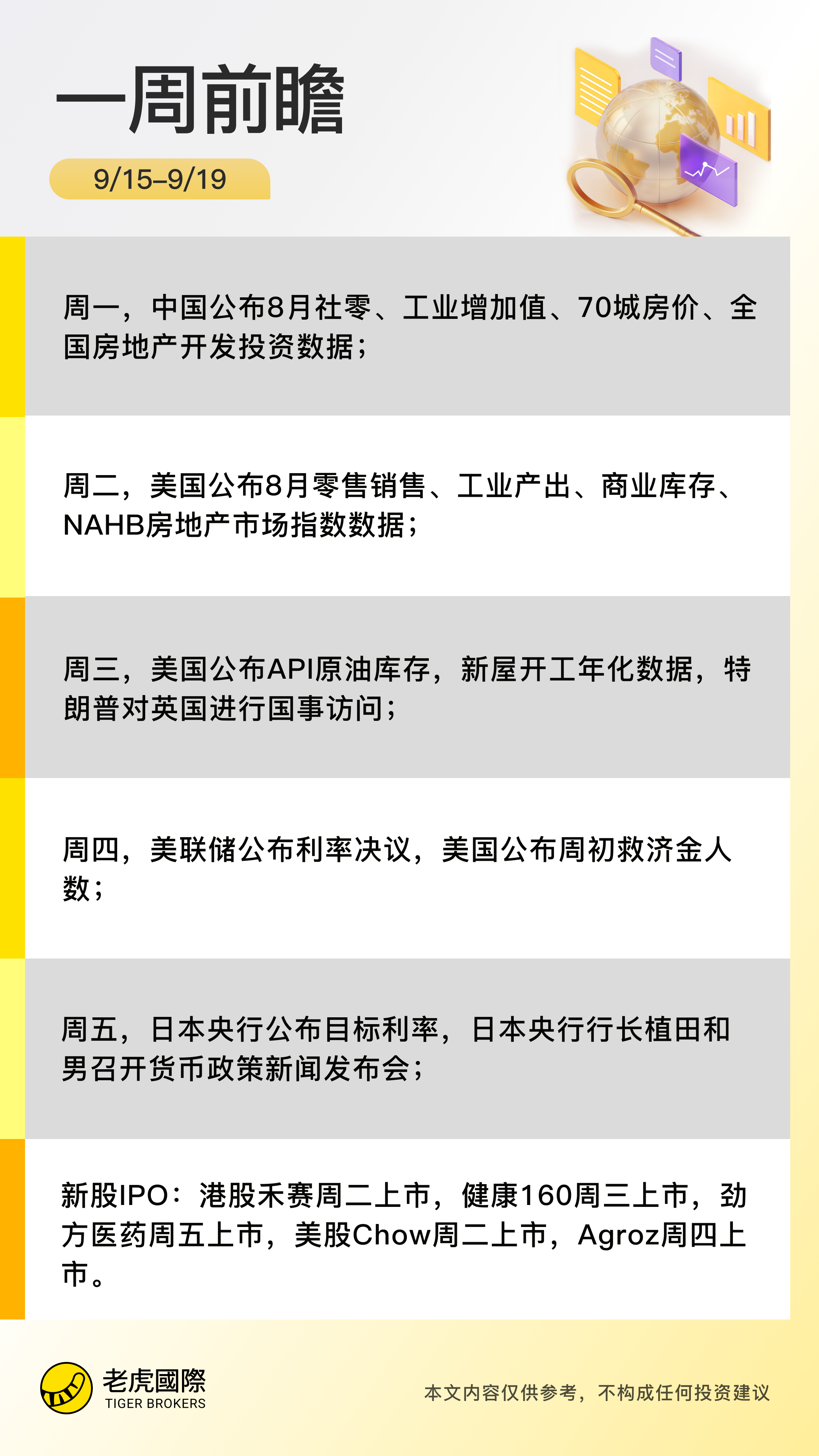 经济数据:美联储利率决议重磅来袭,美国公布周初救济金人数,API原油库存数据;中国公布8月社零、工业增加值、70城房价、全国房地产开发投资数据;英国央行公布政策利率,日本央行公布目标利率。