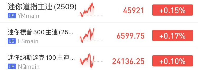 美股三大指数期货盘前小幅拉升,纳指期货 $NQmain 涨0.10%,标普500期货 $ESmain 涨0.17%,道指期货 $YMmain 涨0.15%。