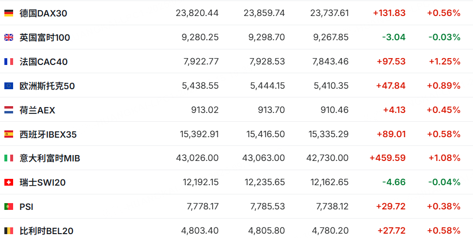 欧洲主要股指涨多跌少,德国DAX30涨0.56%,法国CAC40涨1.25%。
