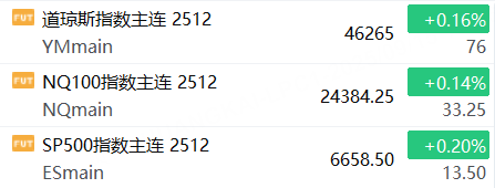 9月15日,美股三大股指期货上涨,截止发稿,道指期货涨0.16%,纳指期货涨0.14%,标普500指数期货涨0.20%。