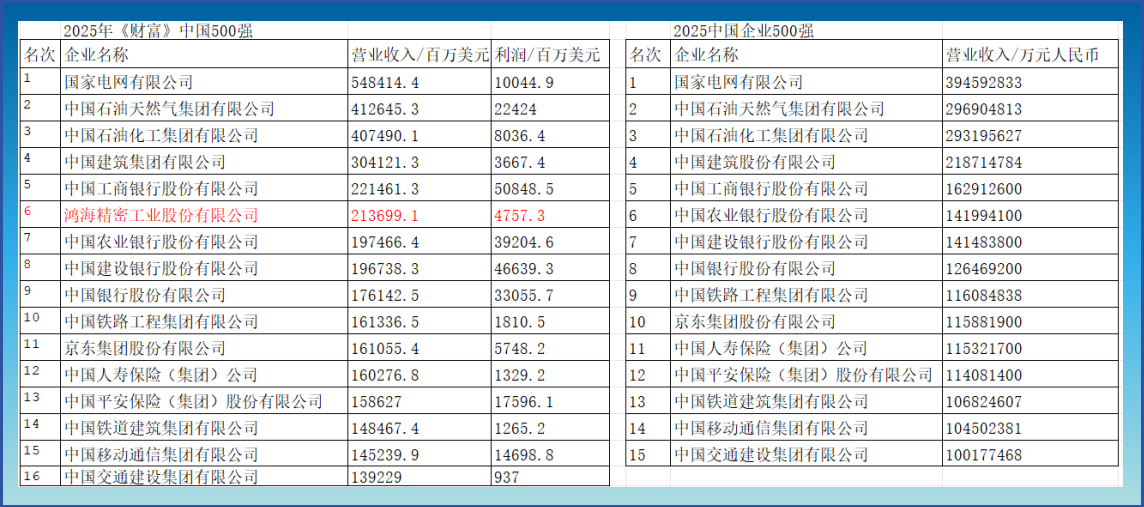 中国企联的2025中国企业500强与《财富》中国500强前列高度相似,其中后者仅有鸿海精密工业股份有限公司插入至第六位,其余名次企业基本相同。而之所以鸿海精密未能入选中国企联的500强名单,核心原因在于其注册地与资本属性不符合该榜单的申报规则。鸿海精密总部位于中国台湾新北市,其注册地与控股结构均属于台湾地区,尽管其在中国大陆拥有庞大的生产基地和业务布局,但按照规则仍被归类为“港澳台独资控股企业”。