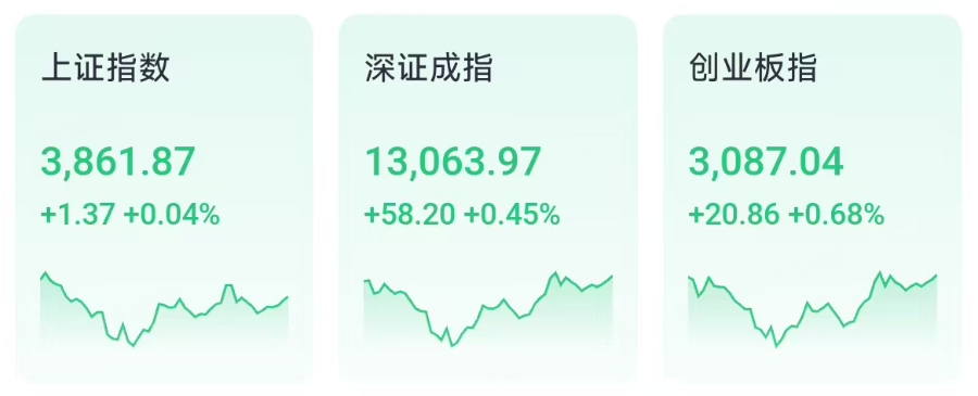 今日A股呈探底回升走势。截至收盘,沪指涨0.04%报3861.87点,深成指涨0.45%报13063.97点,创业板指涨0.68%报3087.04点。盘面上热点较为散乱,市场全天成交2.3万亿,较前一交易日小幅放量。