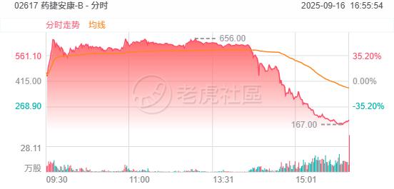 药捷安康-B早间涨近60%,午后一路暴跌,收盘跌超53%,全日振幅超100%。总市值由日内最高约2700亿港元跌至不足800亿港元。