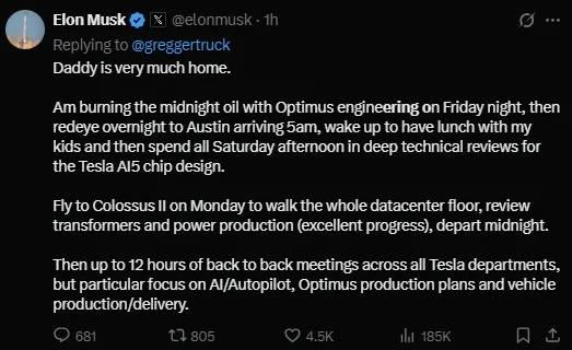 马斯克称,计划周六对AI5芯片设计进行技术评估,下周将召开关于人工智能/自动驾驶系统、擎天柱(Optimus)机器人、车辆产量的会议。