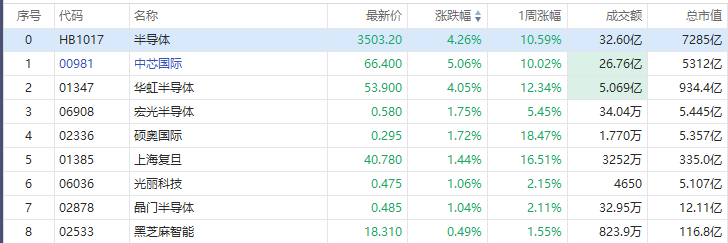 华盛资讯9月17日讯,港股半导体概念股大涨,中芯国际涨超5%、华虹半导体涨超4%,上海复旦涨、黑芝麻智能、宏光半导体等跟涨。