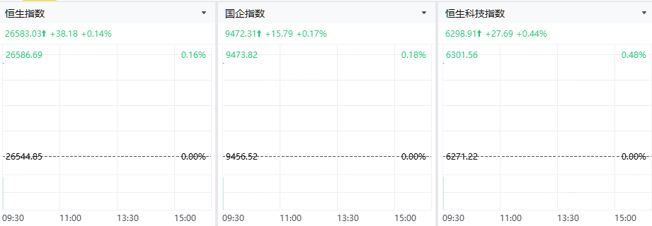 9月19日(周五)三大指数高开,香港恒生指数开盘上涨38.18点,涨幅0.14%,报26583.03点;香港恒生科技指数开盘上涨27.69点,涨幅0.44%,报6298.91点;国企指数开盘上涨15.79点,涨幅0.17%,报9472.31点。