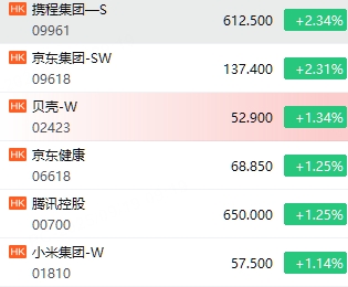 科网股多数上涨,携程、京东涨超2%,小米、腾讯、贝壳、京东健康涨超1%。