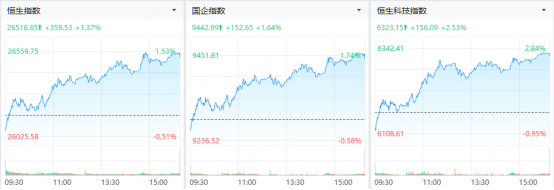9月24日(周三),港股三大指数全天呈现单边上涨行情,市场做多情绪再度活跃。截至收盘,恒生科技指数涨2.53%领跑,恒生指数涨1.37%重回26500点关口,国企指数涨1.64%。