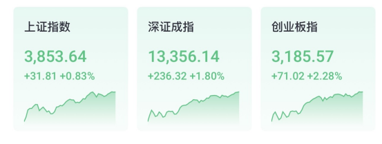 A股三大指数今日集体上涨,深证成指、创业板指续创年内新高;截至收盘,沪指涨0.83%报3853点,深证成指涨1.8%,创业板指涨2.28%,科创50指数涨3.49%。全市场成交额2.35万亿元,较前一交易日缩量1713亿元,超4400股上涨。