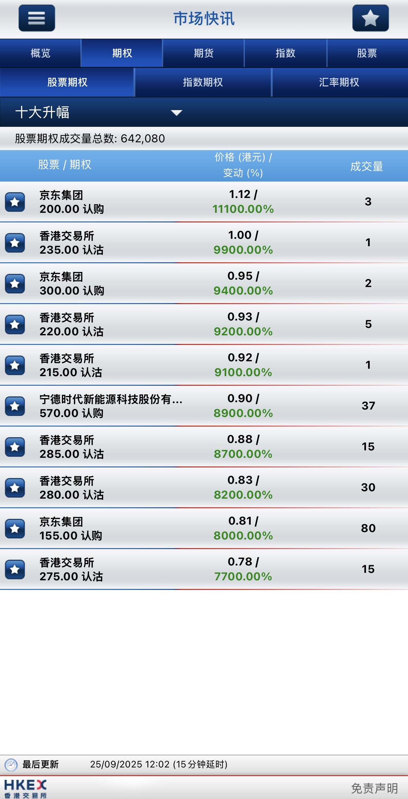 京东集团早盘大涨超6%,香港交易所早盘微跌0.09%,宁德时代大涨超5%,从十大升幅榜单中发现,今日京东集团200港元的认购期权涨幅最高达11100%。