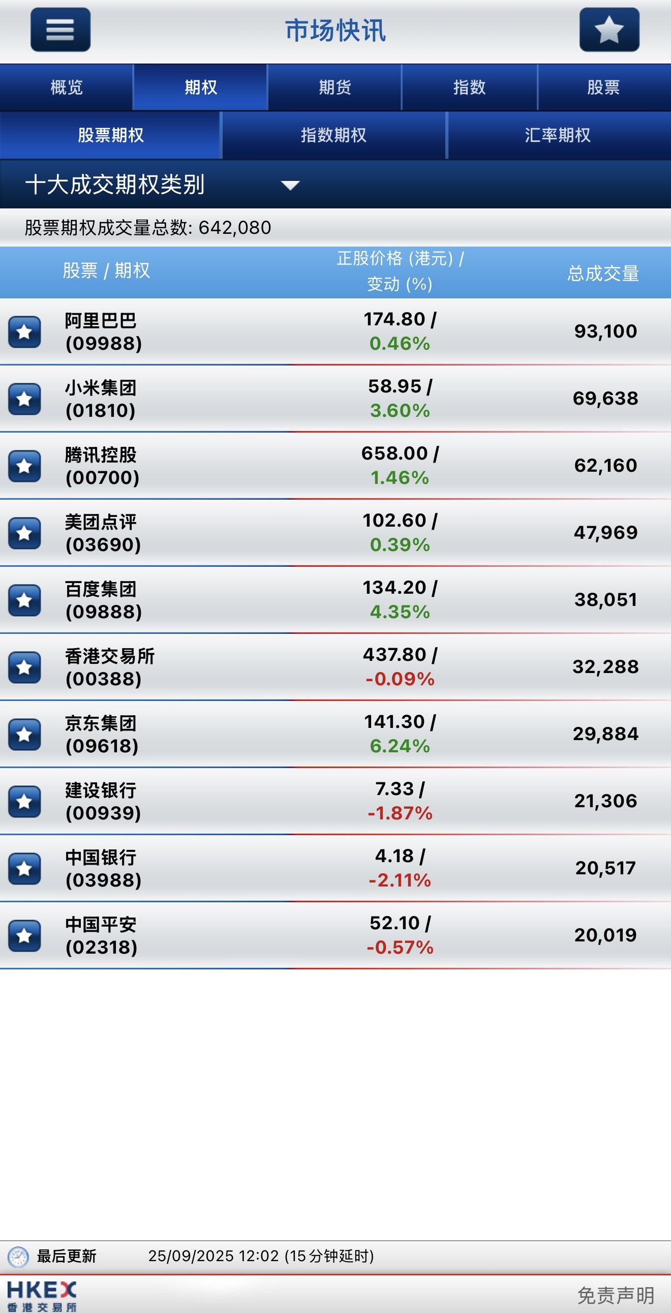 截止午间收盘,港股期权半日成交64万张,其中,阿里巴巴成交量居前,期权成交9.3万张;小米集团位居次席,期权成交6.9万张;腾讯控股名列第三,期权成交6.2万张。