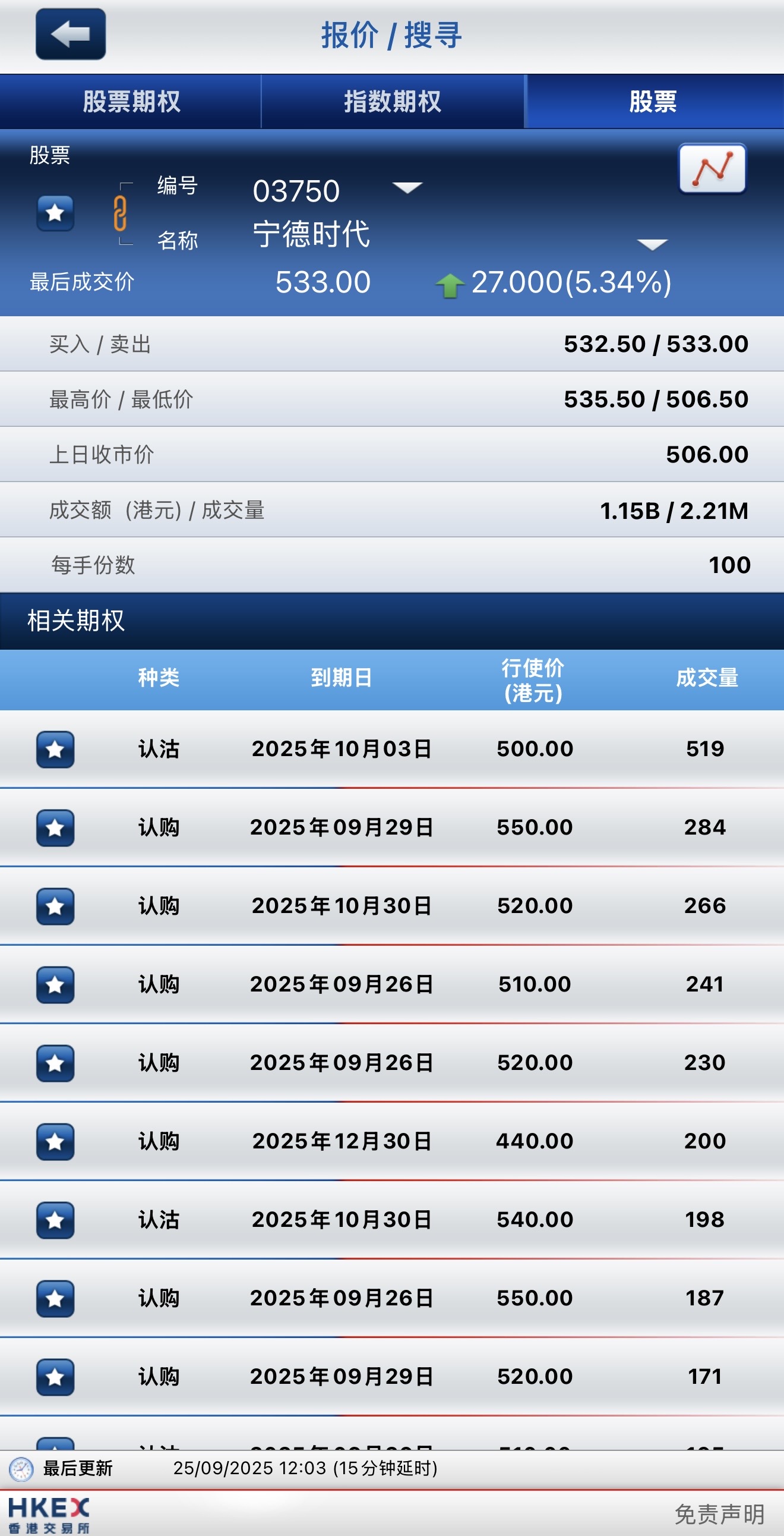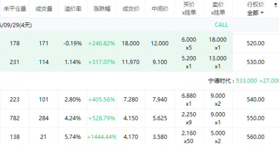 此外,宁德时代多张9月29日到期行权价520-560港元的认购期权最低涨幅超200%。