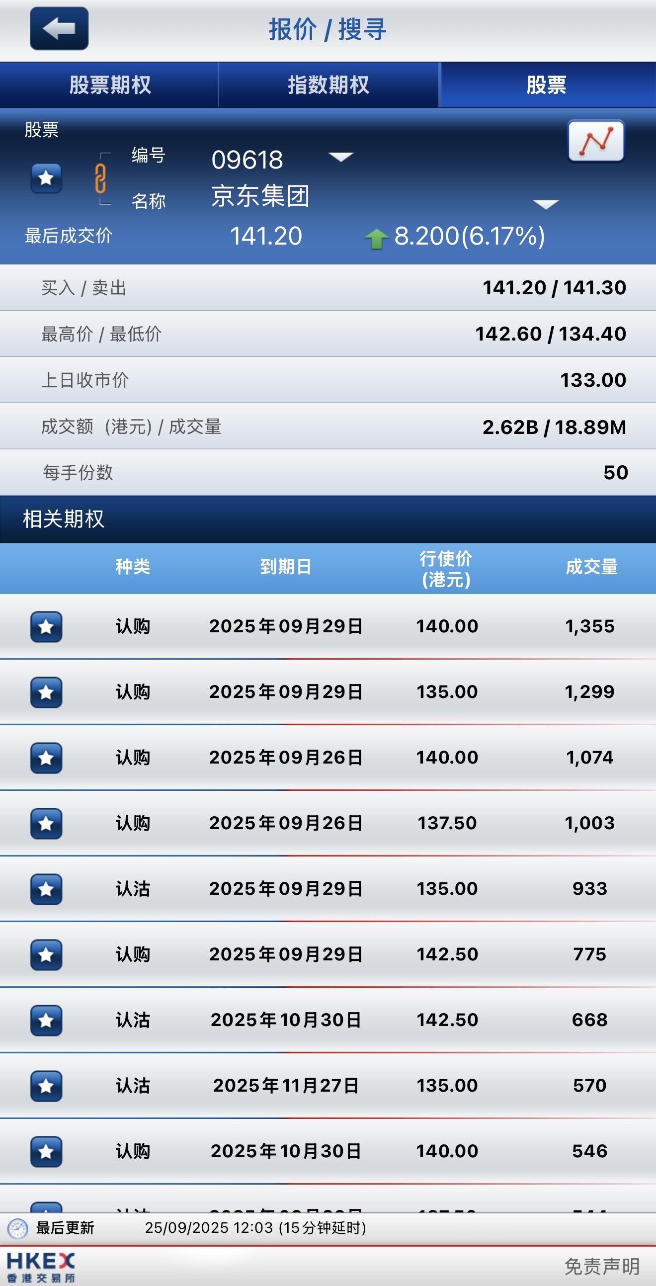 京东集团早盘大涨超6%,期权方面:京东集团200港元的认购期权涨幅最高达11100%,9月29日到期行权价140港元的认购期权成交量居前,成交1355张合约。