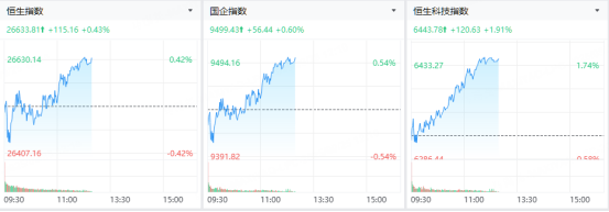 9月25日,港股三大指数继续昨日上涨行情,科技股助力,恒生科技指数午间再度大涨1.91%,恒生指数、国企指数分别上涨0.43%及0.6%,市场做多情绪持续回暖。